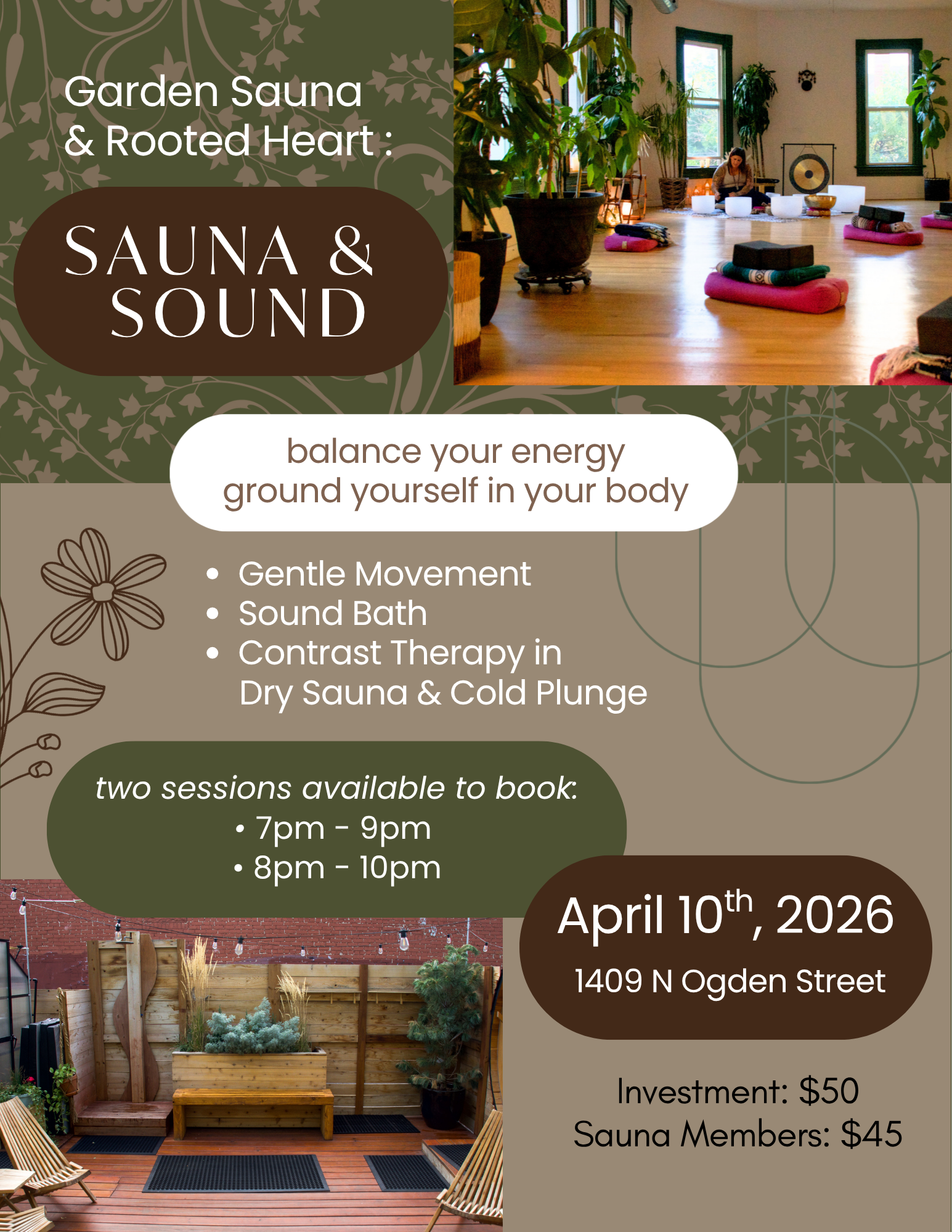 Join us on April 10th for an evening of deep physical and mental relaxation. Your evening will begin with gentle movement and restorative movement with Rumi, followed by a soothing sound bath with Nikki, to calm your mind and body. This will be followed by a rejuvenating sauna and cold plunge session to release tension and promote a balanced nervous system and restful sleep.